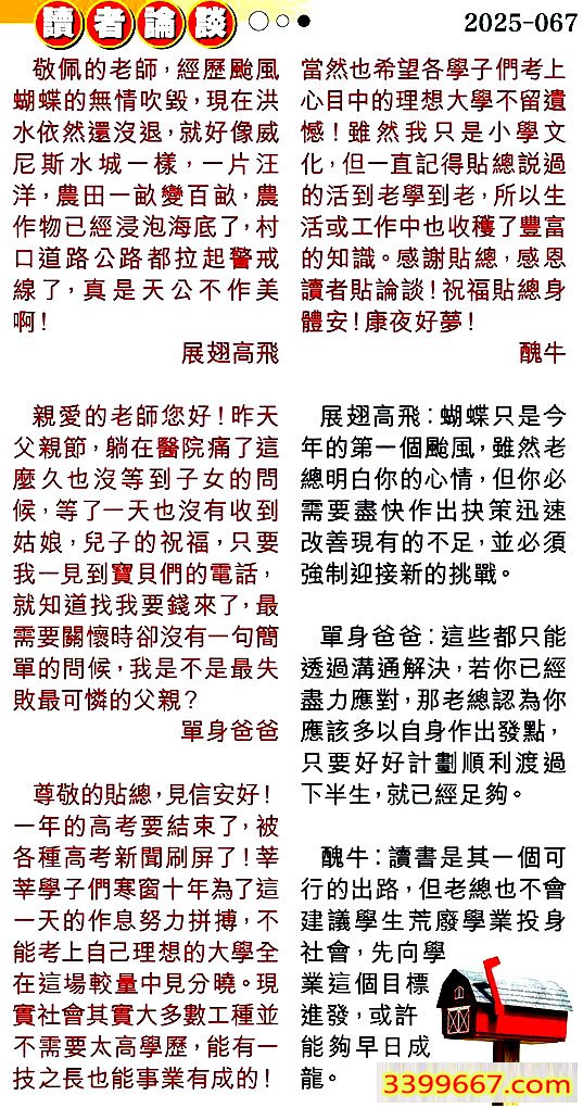 | 主题 :067期:彩民推荐〖貼信讀者論壇〗 |