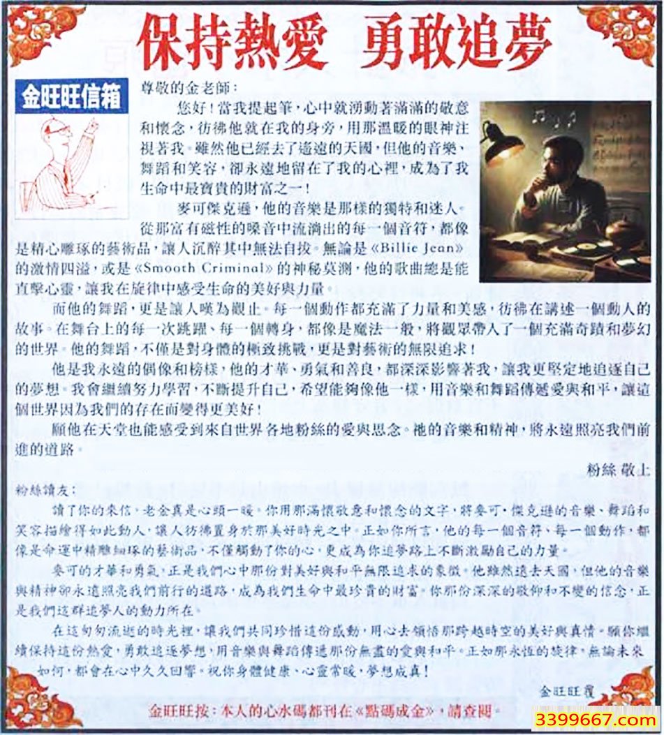 | 主题 :073期:金旺旺信箱彩民推荐→→《保持熱愛 勇敢追夢》 |