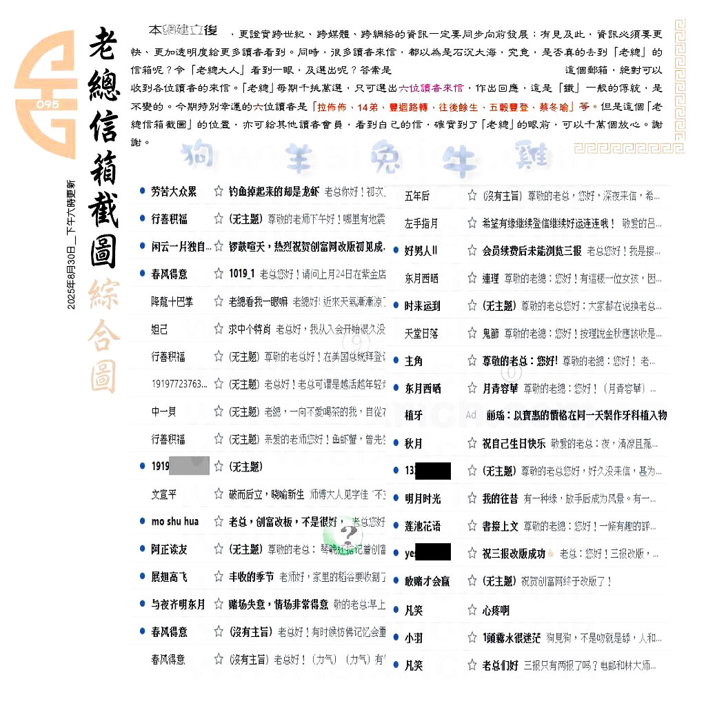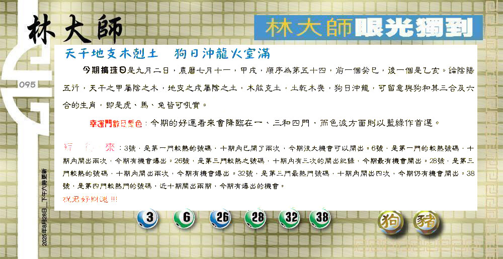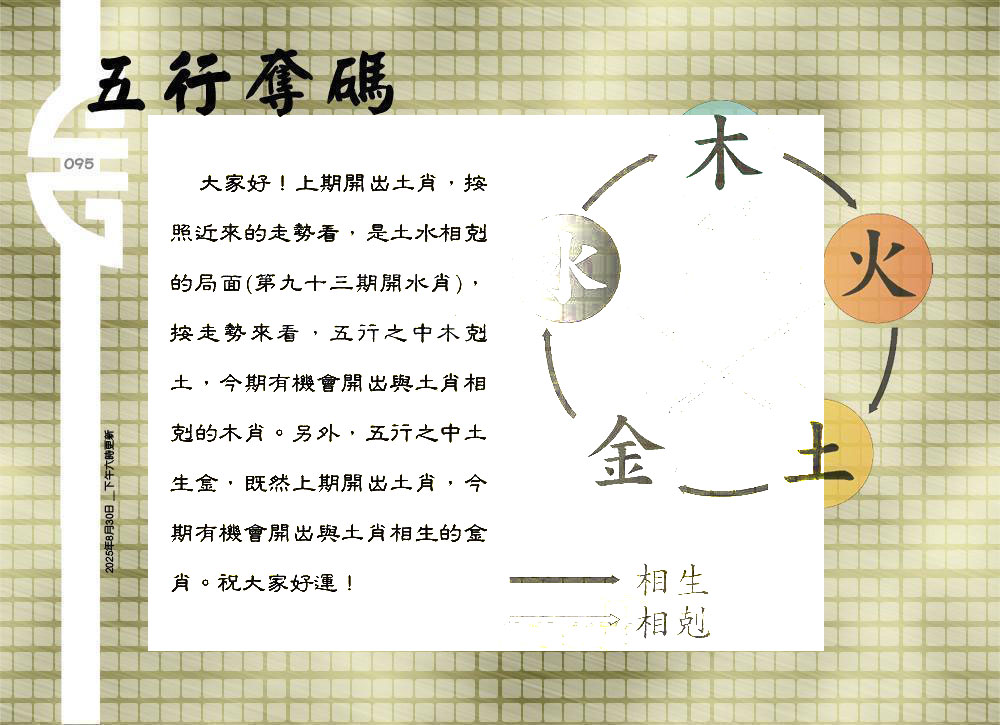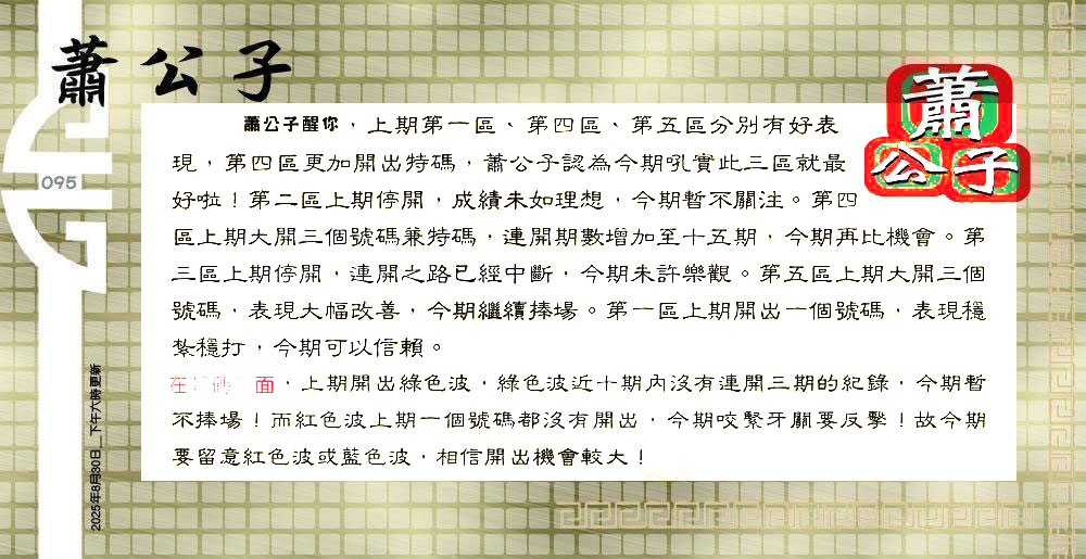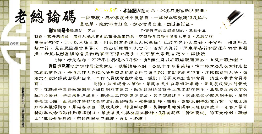 | 主题 :095期:六合皇金句/老总论码/萧公子/林大师/五行夺码/老总信箱截 |