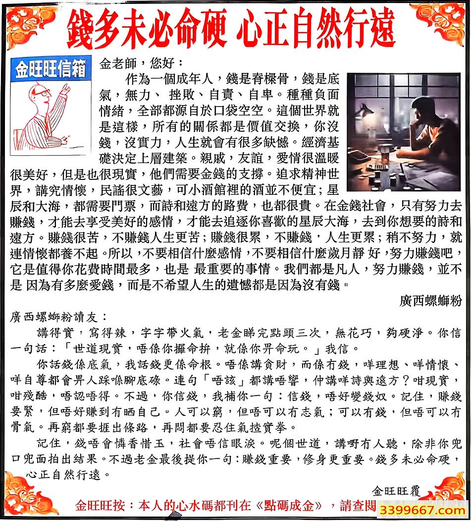 | 主题 :098期:金旺旺信箱彩民推荐→→《錢多未必命硬 心正自然行遠》 |