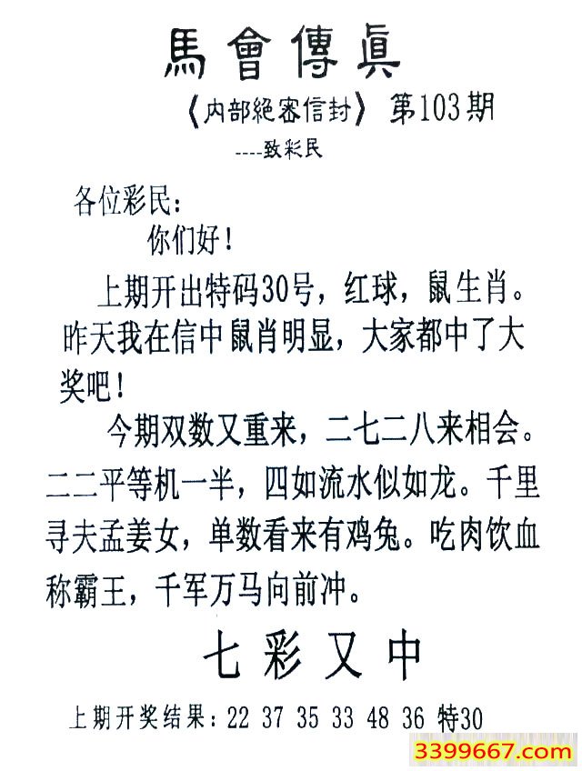 | 主题 :103期:首发推荐:≮馬會傳眞≯→(香港正版) |
