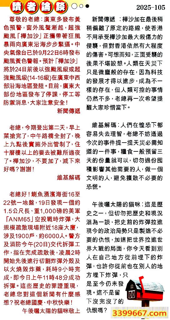 | 主题 :105期:彩民推荐〖貼信讀者論壇〗 |