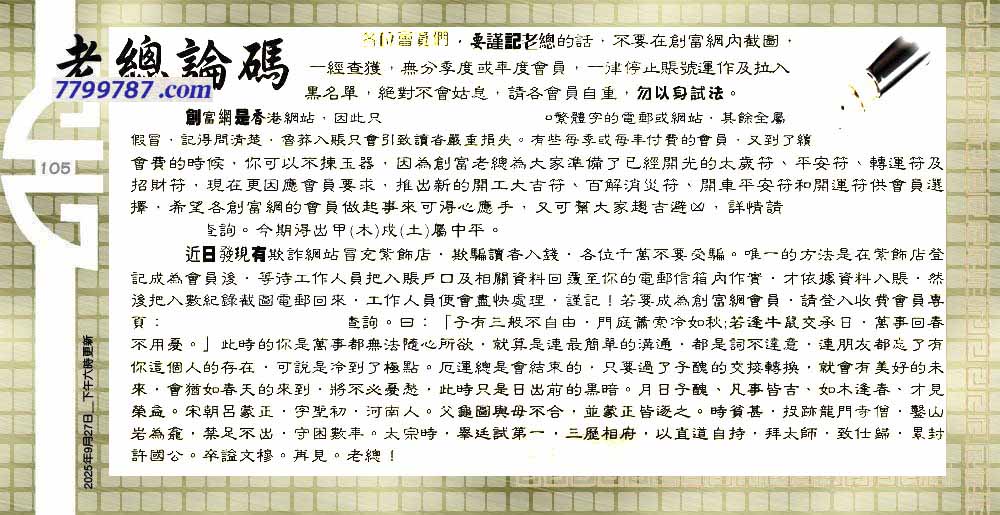 | 主题 :105期:六合皇金句/老总论码/萧公子/林大师/五行夺码/老总信箱截 |