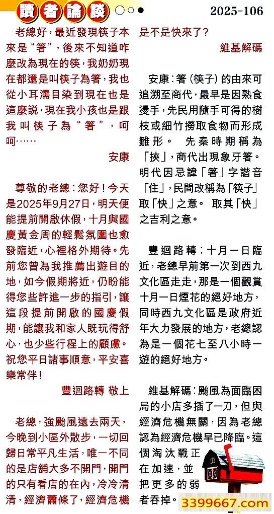 | 主题 :106期:彩民推荐〖貼信讀者論壇〗 |