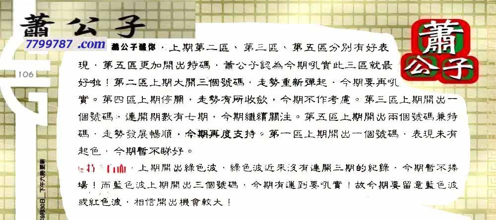 | 主题 :106期:老总论码/萧公子/林大师/五行夺码 |