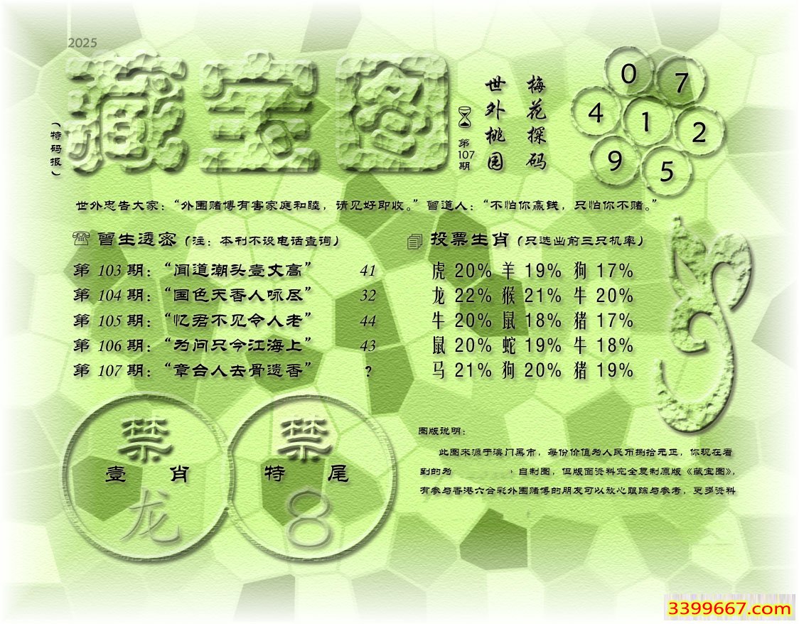 | 主题 :107期藏寶圖 新:面对参江背伍峰 老:章台人去骨遗香 禁:龙 禁:8尾 |