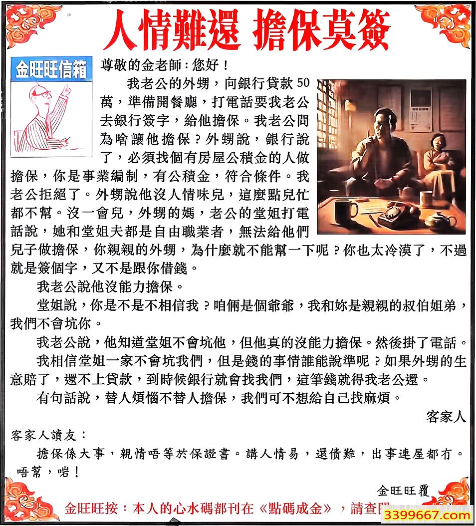 | 主题 :129期:金旺旺信箱彩民推荐→→《人情難還 擔保莫簽》 |