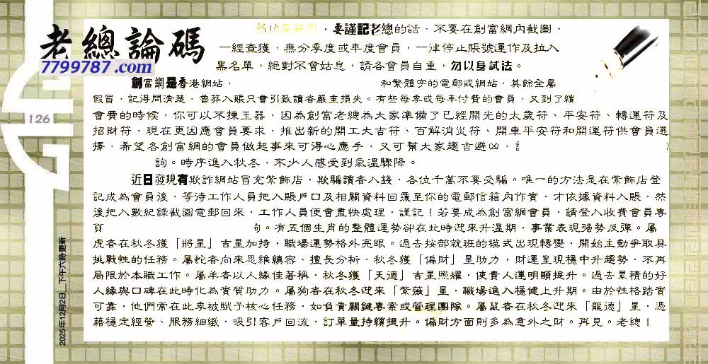 | 主题 :126期:六合皇金句/老总论码/萧公子/林大师/五行夺码/老总信箱截 |