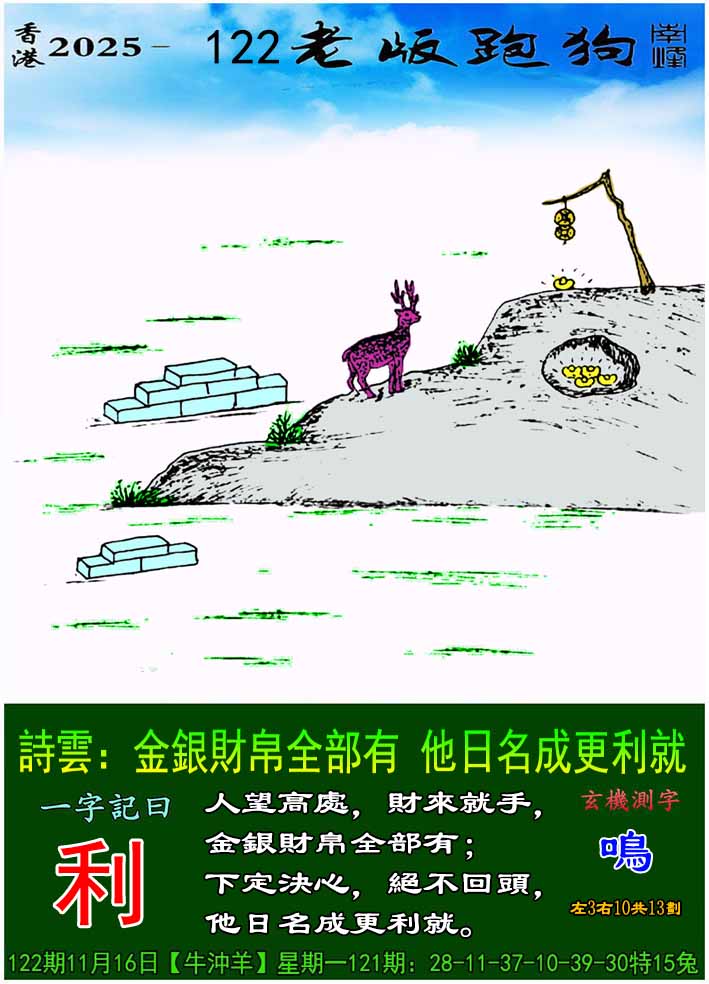| 主题 :122期老版跑狗一字記之曰:【利】 玄機測字:《鳴》 |