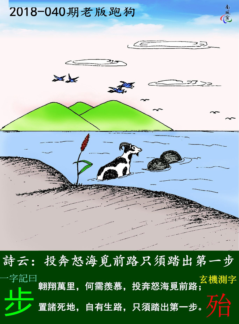分析:翱翔萬里,何需羡慕,投奔怒海覓前路;图中的山羊羡慕翱翔天空的大雁,羡慕它们有远大的前程。再回想到自身,年老却一事无成(看图中山羊双角弯曲,胡子挺长,看过去已经很老的样子)顿时伤感满身。置諸死地,自有生路,只須踏出第一步。说明山羊勇敢的往前踏出了步伐,重新看到了希望,置之死地而后生。所以最后总结出“只須踏出第一步”就是说成功跟失败只是一步之遥!图中山羊勇敢踏出了第一步,至少说明它离成功已经越来越近。