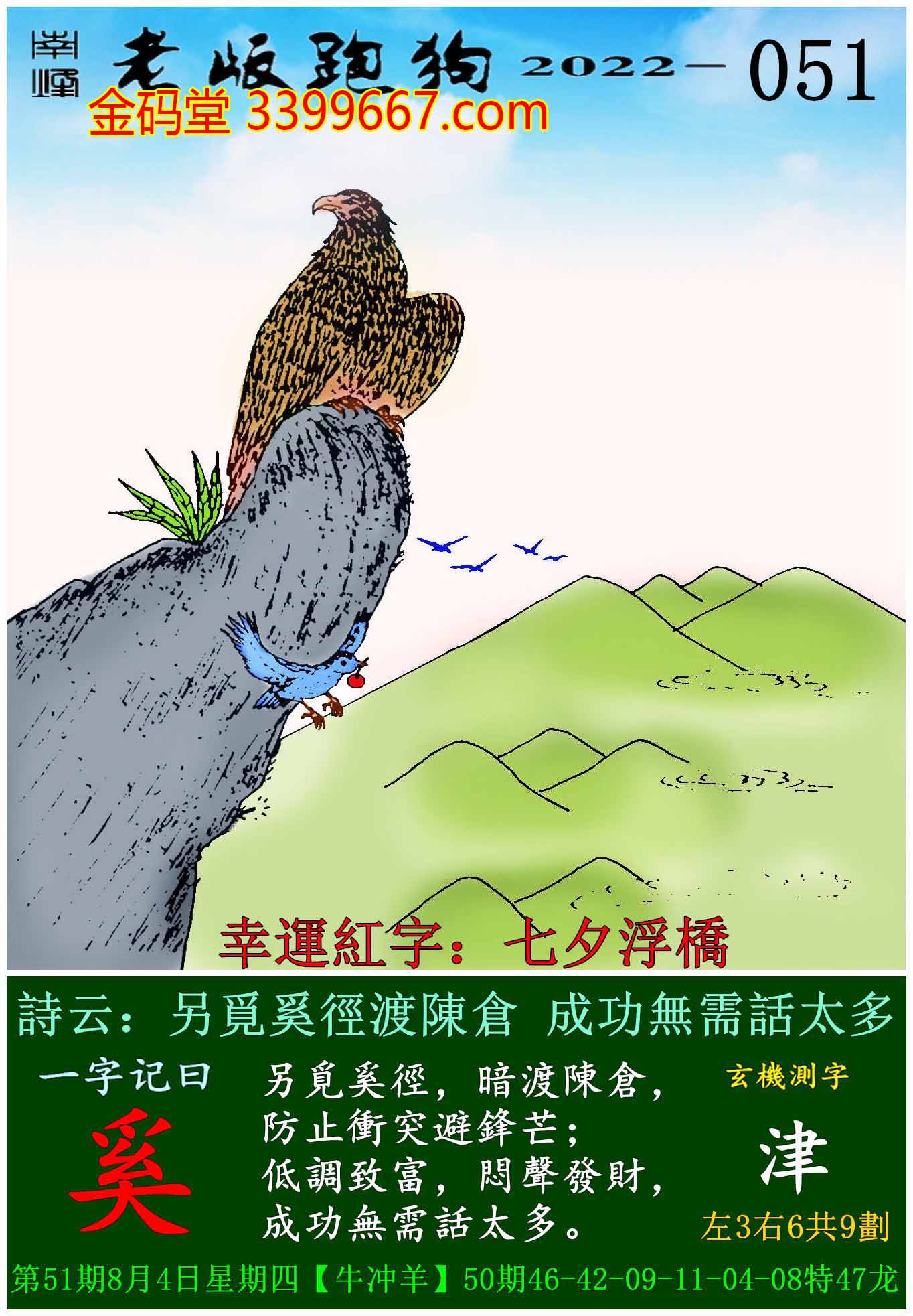 051期老版跑狗一字記之曰:【奚】玄機測字:《津》