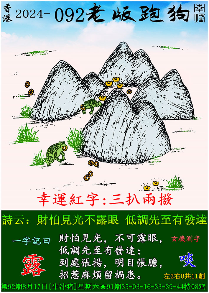 092期老版跑狗一字記之曰:【露】 玄機測字:《啖》
