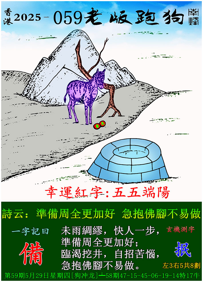 059期老版跑狗一字記之曰:【備】 玄機測字:《抿》