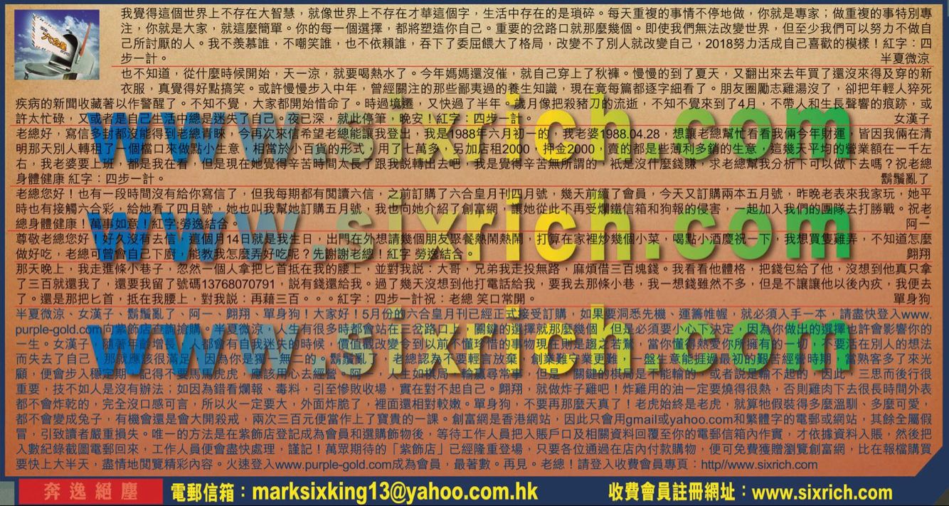【4】老總您好!也有一段時間沒有給你寫信了,但我每期都有閲讀六信,之前訂購了六合皇月刊四月號,幾天前續了會員,今天又訂購兩本五月號,昨晚老表來我家玩,她平時也有接觸六合彩,給她看了四月號,她也叫我幫她訂購五月號,我也向她介紹了創富網,讓她從此不再受爛鐵信箱和狗報的侵害,一起加入我們的團隊去打勝戰,祝老總身體健康!萬事如意!紅字:勞逸結合。     ---阿一