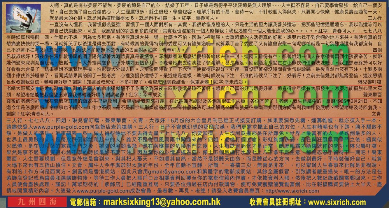 【5】老總大哥萬安!最近亂如麻,亂的是窮人的命永遠就翻不了身嗎? 到深夜三四點我還是睡不著啊。感覺自己真的好苦過得好累,總覺得今年還有大事發生,怎麼才能擺脱心里大石頭。希望老總能把我信登出來讓我轉轉運好嗎?谢謝老總!紅字:幸来成災。      ---聲東擊酉