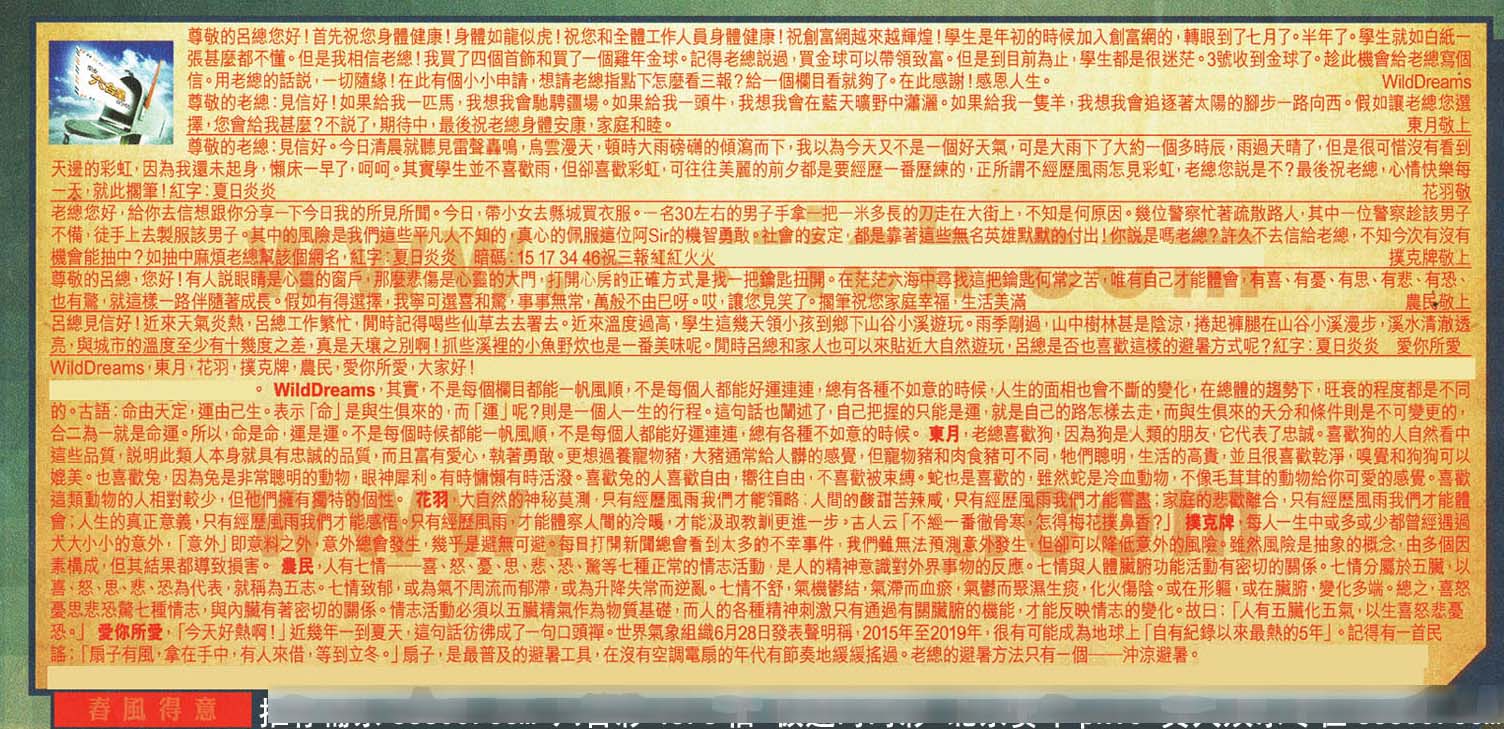 【1】尊敬的呂總您好!首先祝您身體健康!身體如龍似虎!祝您和全體工作人員身體建康!祝創富網越來越輝煌!學生是年初的時候加入創富網的,轉眼到了七月了。半年了。學生就如白紙一張甚麼都不懂。但是我相信老總!我買了四個首飾和買了一個雞年金球。記得老總說過買金球可以帶領致富。但是到目前為止,學生都是很迷茫。3號收到金球了。趁此機會給老總寫個信。用老總的話說,-切隨緣!在此有個小小申請,想請老總指點下怎麼看三報?給一個欄目看就夠了。在此感謝!感恩人生。 --- WildDreamis