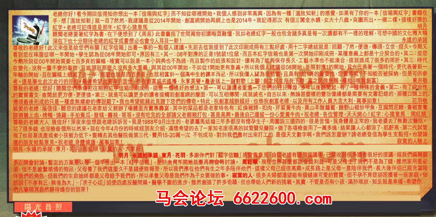 【4】 尊敬的老總:您好!聽聞您們準備把往期的紅字信箱印刷成冊,這是一個很好的想法。第一可以讓讀者重温一下您們的往日輝煌,多年以後翻閱起,有了一種特殊的含羲。第二:有了綜合性的實質書,文查闃起更方便,更便捷。第三,就是可以讓更多的讀者接觸到創富網的層面,可以互相傳鬩, 成就威名。自古以來,無論甚麼樣的豐功偉績都是需要有文書記錄的,那種口頭上的傳颂最後形成的只是一種虚無缥緲的傳說罷了。我也希望能藉此見證下您們的傳奇。特此;祝創富越辦越好,也恭祝創富老總,以及所有工作人员大吉大利,萬事如意!---花羽敬