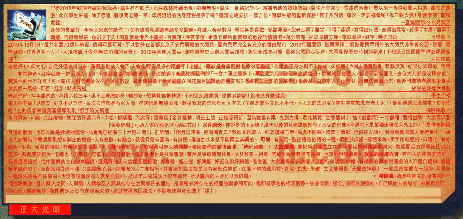【4】老總好!久仰大名,自從好運六肖出來,滿懷激動的入會了,人會後聽得最多的兩個字「老總」,應該是會員們對老總的尊稱吧?你常說不是你財不入你袋, 如好運「六肖」個個包肖; 我就反買,結果你知道的哈哈.......非常神奇。紅字就像一把手術刀,稍有不慎就會給你開膛破肚! 多次驗證了老練教導我們的「一命二運三風水」。再說說六信,登信老說講緣分,每期就那幾個人,都看不到新面孔。去信大凡都是吹捧你的,實質性的也不好登出吧。這些人對老總依依不捨爭先恐後,如此纏綿會不會是老總在風花需月認讖的老朋友呢?老總有如此多的爱慕者好生羨慕。由於本人文化有限,都無法觀摩六信,最後鬥膽請老總高抬貴手放我們一馬吧。可否?紅字:時光飛逝 --- 放屁的好運六肖敬