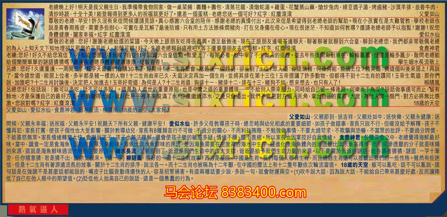 【3】.尊敬的老總:您好!謝謝老總給選的菜譜,今天晚上跟朋友吃得很盡興。酒足飯飽後,現在正跟朋友邊喝茶邊聊天,聊著聊著就聊到六合皇,聊到老總您,我們都非常敬佩老總的為人,上知天文下知地理卻又那麼的平易近人,和藹可親!好了,先跟老總聊到這裡吧。等下還要帶朋友去吃海鮮。紅字:紅塵滾滾  食鹿神君