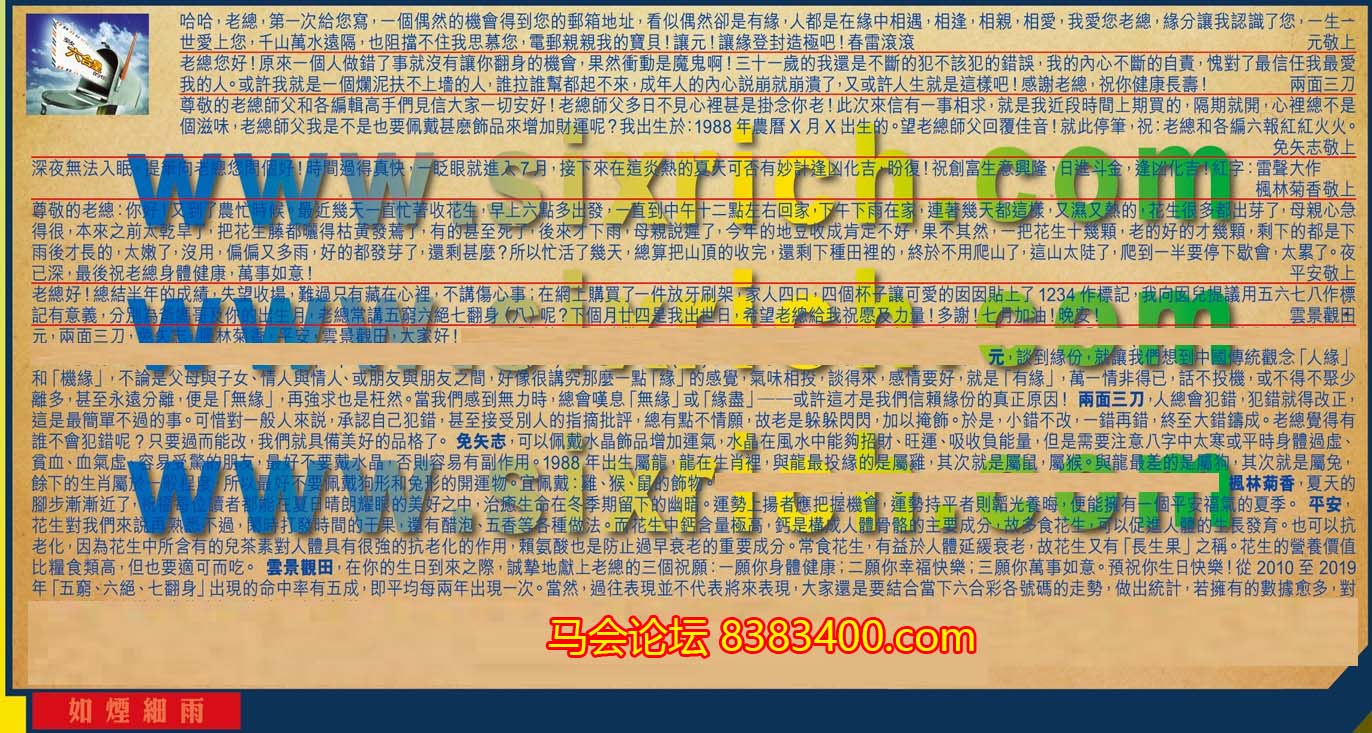 【3】.尊敬的老總師父和各編輯高手們見信大家一切安好!老總師父多日不見心裡甚是掛念你老!此次來信有一事相求,就是我近段時間上期買的,隔期就開,心裡總不是個滋味,老總師父我是不是也要佩戴甚麼飾品來增加財運呢?我出生於:1988年農曆X月X出生的。望老總師父回覆佳音!就此停筆,祝:老總和各編六報紅紅火火。    免矢志敬上