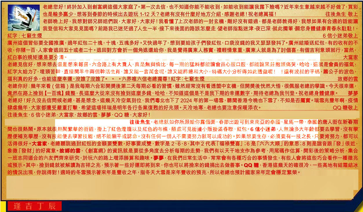 【6】.老總好!好久沒去信問候老總,甚是想念。這幾天冷空氣到位,我們粵北也下了 2024 年的第一場雪,聽聞香港今晚也下雪了,不知是否屬實。瑞雪兆豐年,啊疫情肆虐幾年,大家都遭受嚴重打擊,希望這場祥瑞是明年各行各業復甦的好兆頭。天冷地寒,老總也要注意保暖添衣。 QQ糖敬上