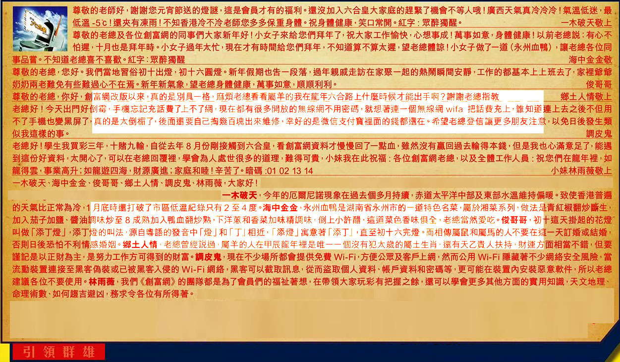 【4】.尊敬的老總,你好,創富網改版以來,真的是別具格,麻煩老總看看屬羊的我在龍年六合路上什麼時候才能出手啊?謝謝老總指教 鄉土人情敬上