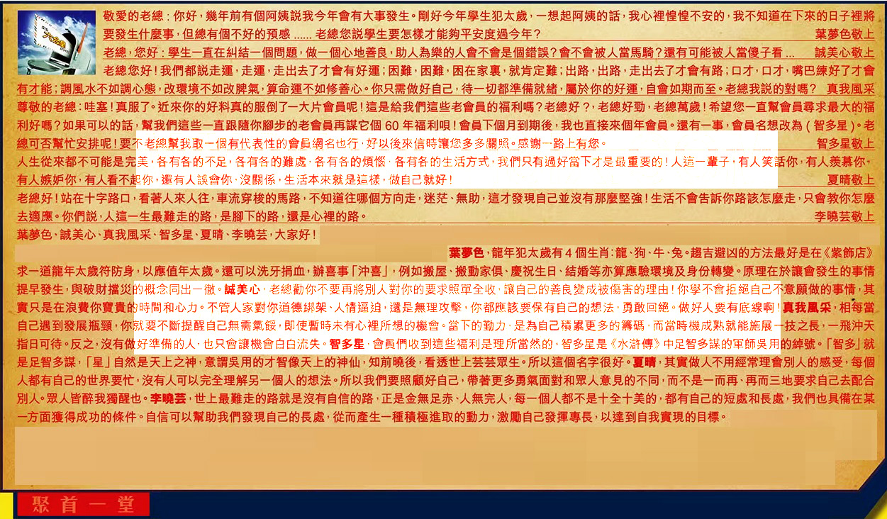 【1】.敬愛的老總:你好,幾年前有個阿姨說我今年會有大事發生。剛好今年學生犯太歲,一想起阿姨的話 ,我心裡惶惶不安的,我不知道在下來的日子裡將要發生什麼事,但總有個不好的預感......老總您說學生要怎樣才能夠平安度過今年?葉夢色敬上