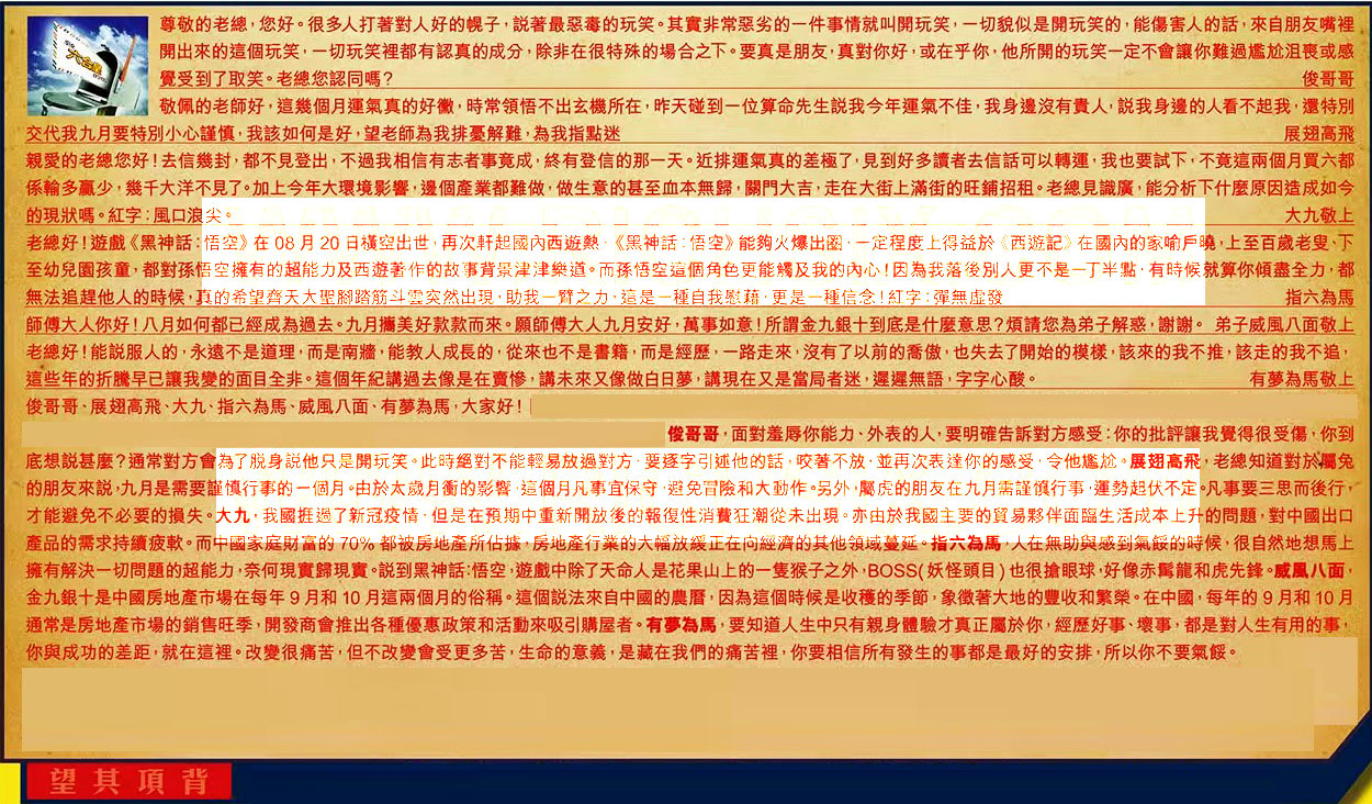 【4】.老總好!遊戲《黑神話:悟空》在 08 月 20 日橫空出世,再次軒起國內西遊熱,《黑神話悟空》能夠火爆出圈,一定程度上得益於《西遊記》在國內的家喻戶曉,上至百歲老叟、下至幼兒園孩童,都對孫悟空擁有的超能力及西遊著作的故事背景津津樂道。而孫悟空這個角色更能觸及我的內心!因為我落後别人更不是一丁半點,有時候就算你傾盡全力,都無法追趕他人的時候,真的希望齊天大聖腳踏筋斗雲突然出現,助我一臂之力,這是一種自我慰藉,更是一種信念!紅字:彈無虛發 指六為馬
