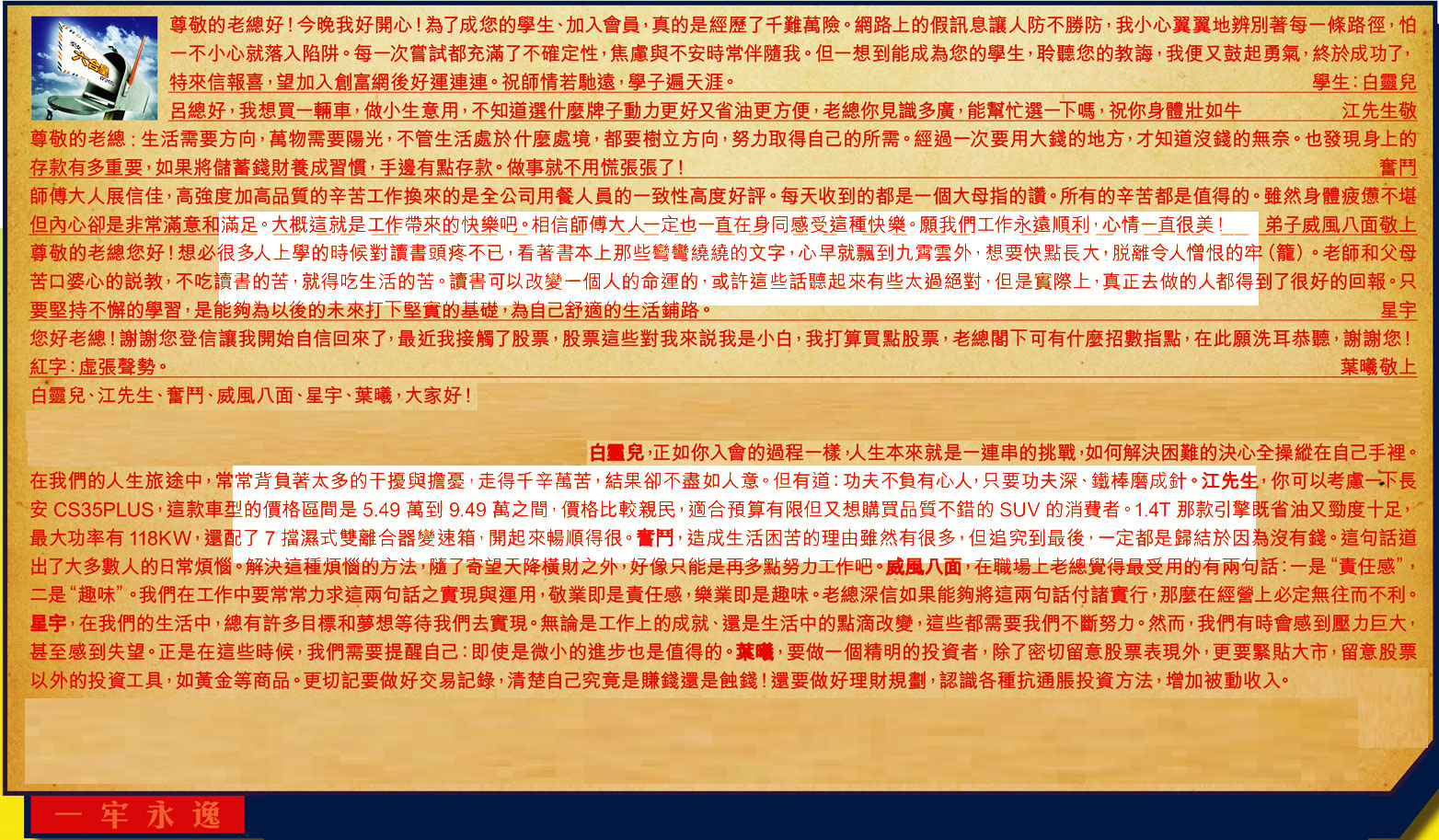 【1】.尊敬的老總好!今晚我好開心!為了成您的學生、加入會員,真的是經歷了千難萬險。網路上的假訊息讓人防不勝防,我小心翼翼地辨別著每條路徑,怕一不小心就落入陷阱。每一次嘗試都充滿了不確定性,焦慮與不安時常伴隨我。但一想到能成為您的學生,聆聽您的教誨,我便又鼓起勇氣,終於成功了,特來信報喜,望加入創富網後好運連連。祝師情若馳遠,學子遍天涯。 學生:白靈兒