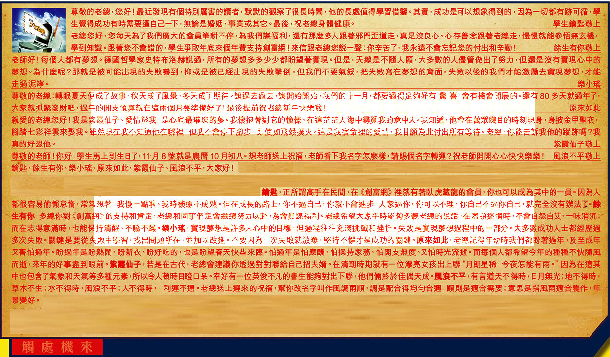 【2】.老總您好,您每天為了我們廣大的會員筆耕不停,為我們謀福利,還有那麼多人跟著邪門歪道走,真是沒良心。心存善念跟著老總走,慢慢就能參悟無玄機,學到知識。跟著您不會錯的,學生爭取年底來個年費支持創富網!來信跟老總您說一聲你辛苦 了,我永遠不會忘記您的付出和辛勤! 餘生有你敬上