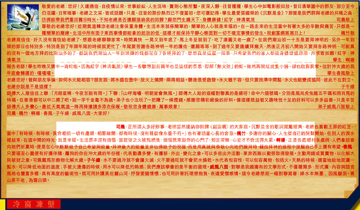 【1】.敬愛的老總:您好!久達通信,自疫情以來,世事紛紜,人生況味,實則心態所擊。夜深人靜,往昔種種,學生心中如電影般回放。昔日清華園中的群友,部分至今仍活躍,日常瑣事,老總之文采,皆成話題。只是,往昔的那份熱烈已不復當初您可還記得,學生最爱張國榮的《沉默是金》?那曾是我們群與老總的共鳴之曲,彷佛能帶我們重回舊日時光。不知老總是否還願接納我的回歸?願您門生遍天下,身體康健!紅字:神清氣茂 司晨敬上