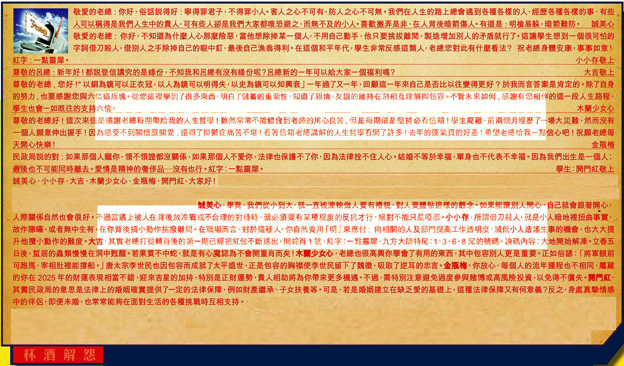 019期:彩民推荐六合皇信箱(紅字:杯酒解怨)
