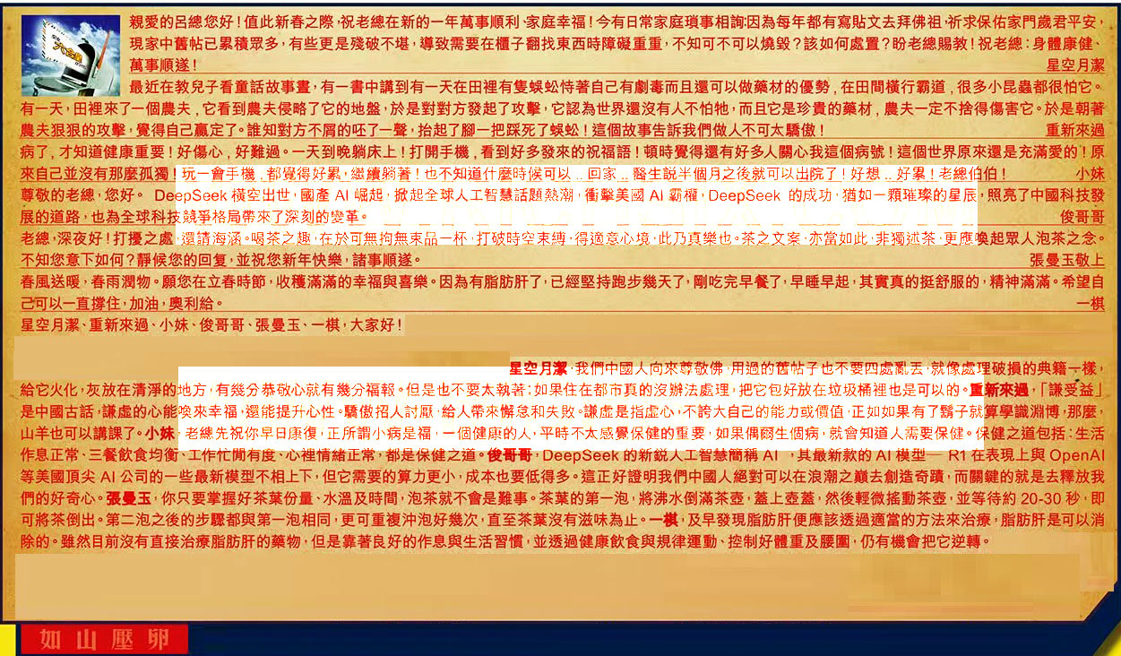 【1】.親愛的呂總您好!值此新春之際,祝老總在新的一年萬事順利、家庭幸福!今有日常家庭瑣事相詢:因為每年都有寫貼文去拜佛祖,祈求保佑家門歲君平安,現家中舊帖已累積眾多,有些更是殘破不堪,導致需要在櫃子翻找東西時障礙重重,不知可不可以燒毀?該如何處置?盼老總賜教!祝老總:身體康健萬事順遂! 星空月潔