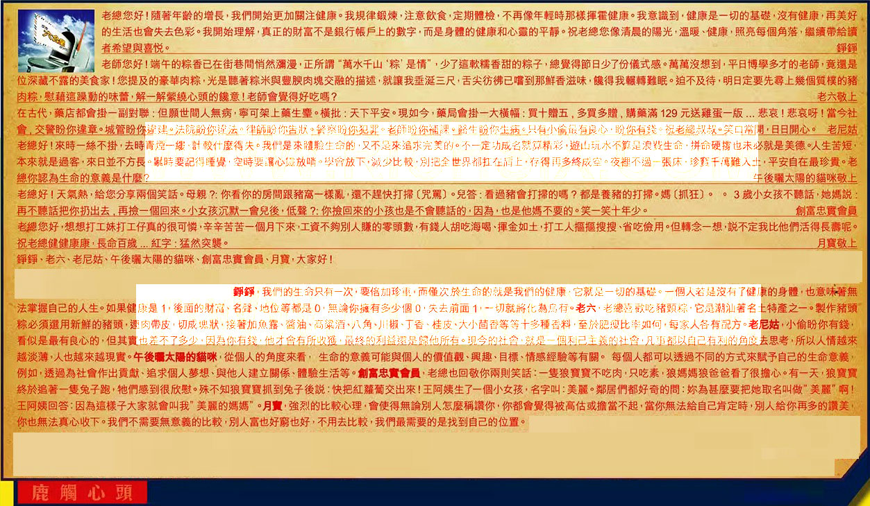【6】.老總您好,想想打工妹打工仔真的很可憐,辛辛苦苦一個月下來,工資不夠別人賺的零頭數,有錢人胡吃海喝、揮金如士,打工人摳摳搜搜、省吃儉用。但轉念一想,說不定我比他們活得長壽呢。祝老總健健康康,長命百歲...紅字:猛然突襲。 月寶敬上