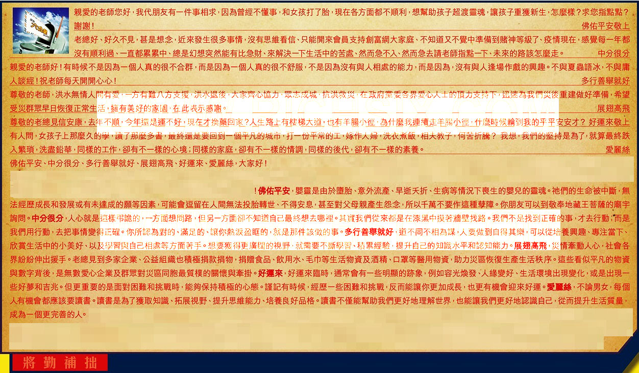 【1】.親愛的老師您好,我代朋友有一件事相求,因為曾經不懂事,和女孩打了胎,現在各方面都不順利,想幫助孩子超渡靈魂,讓孩子重獲新生,怎麼様?求您指點點?謝謝! 佛佑平安敬上