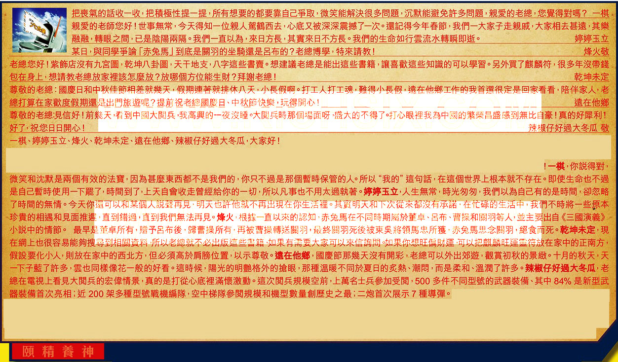 【6】.尊敬的老總:見信好!前幾天,看到中國大閲兵,我高興的一夜沒睡,大閲兵時那個場面呀,盛大的不得了。打心眼裡我為中國的繁榮昌盛感到無比自豪!真的好犀利!好了,祝您日日開心! 辣椒仔好過大冬瓜敬