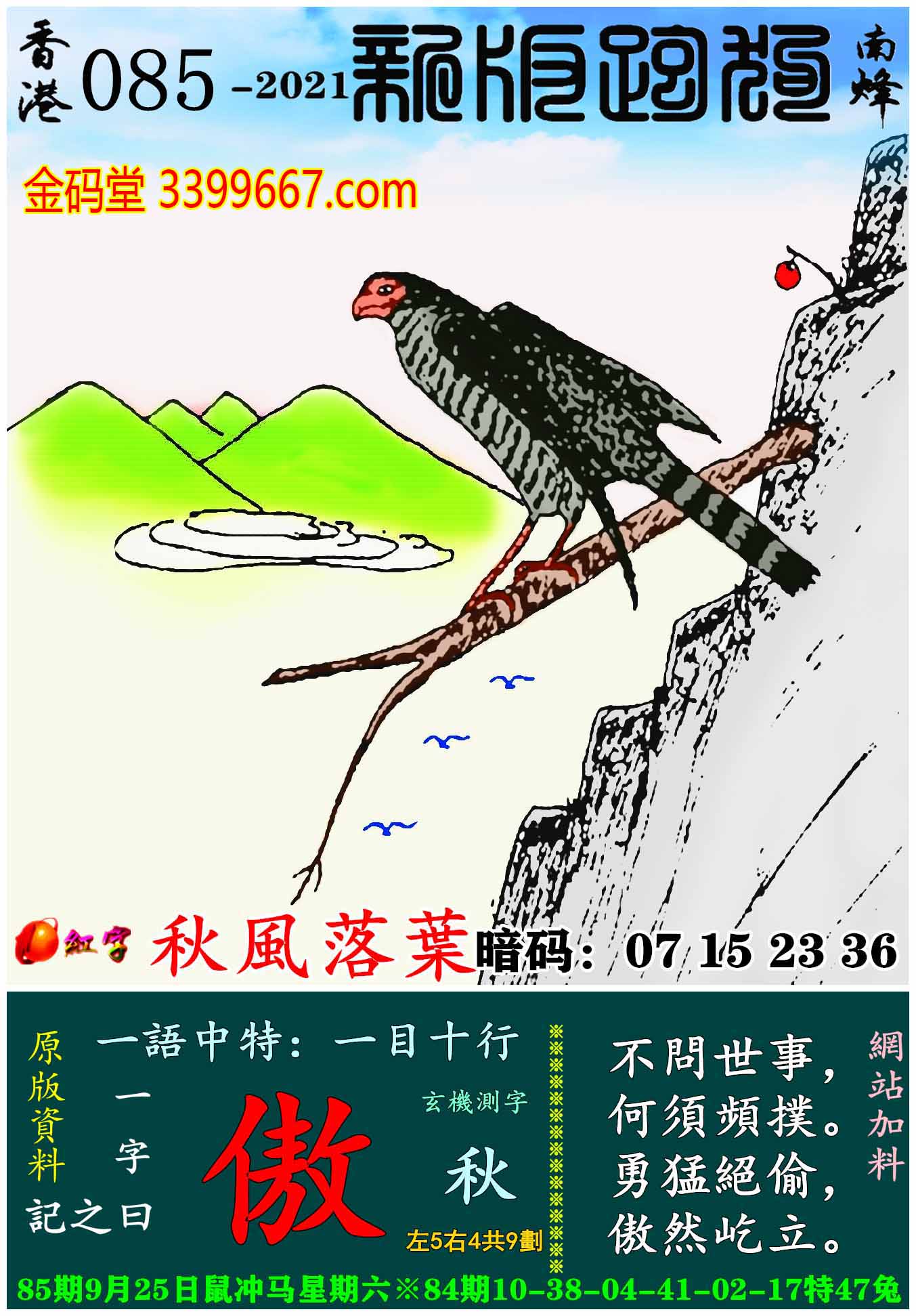 085期:新版跑狗一字記之曰【傲】玄機測字:《秋》