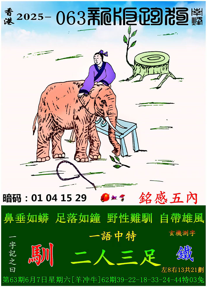 063期:新版跑狗一字記之曰【馴】 玄機測字:【鐵】