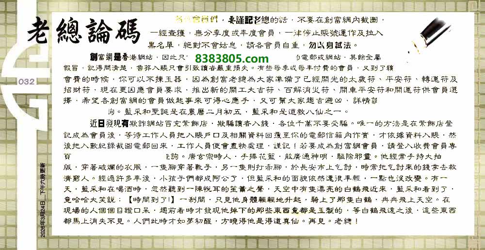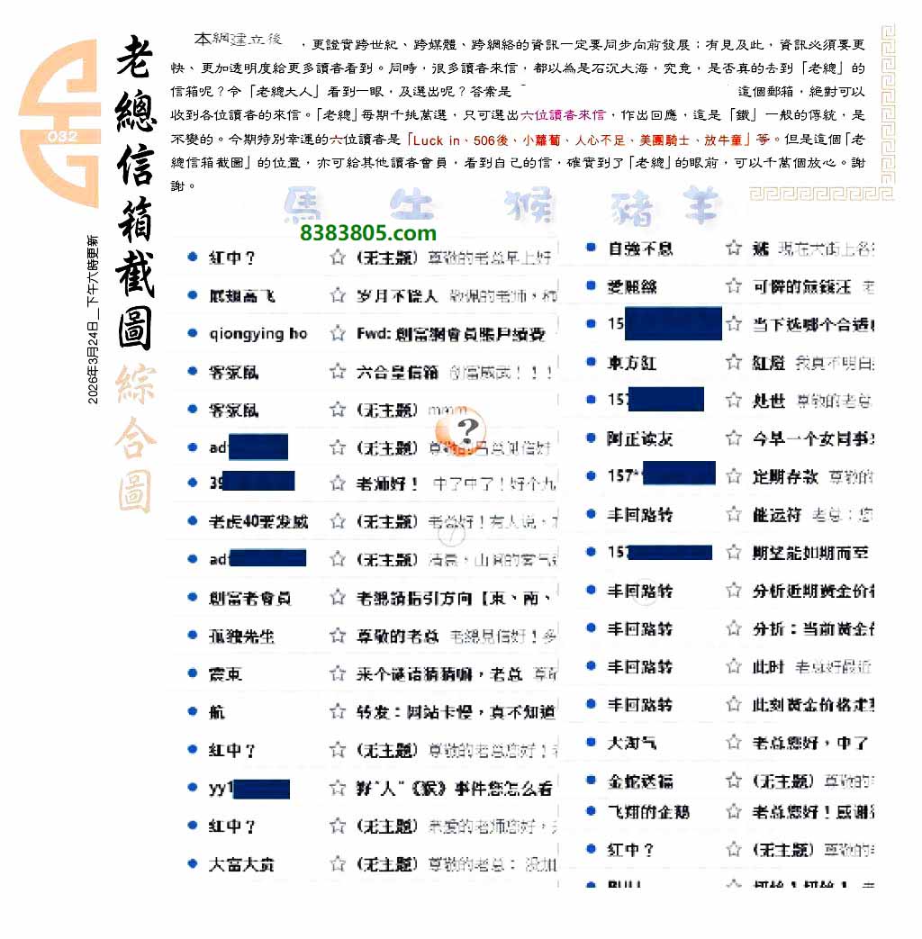 主题 : 032期:六合皇金句/老总论码/萧公子/林大师/五行夺码/老总信箱截图