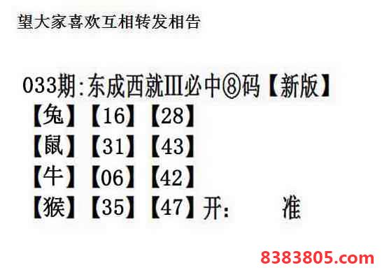 主题 : 033期:另版【东成西就四肖8码】